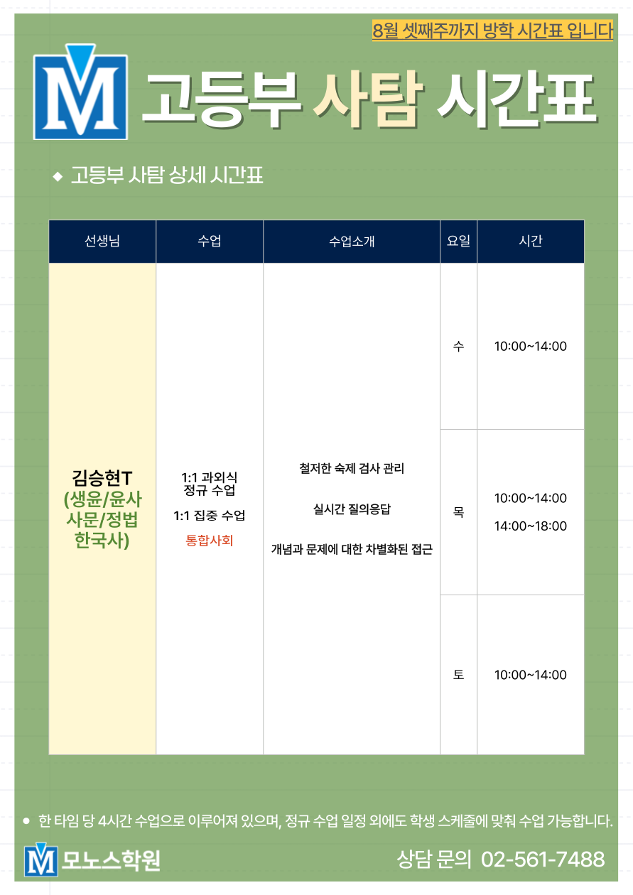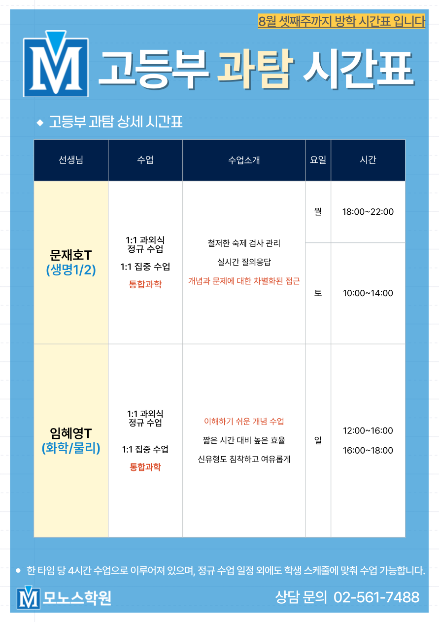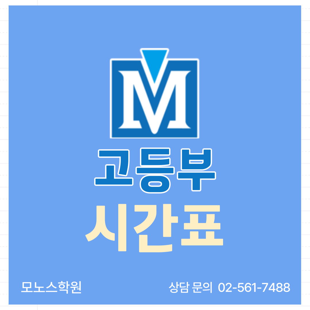 [대치동 모노스학원] 2025 여름방학 고등부 시간표